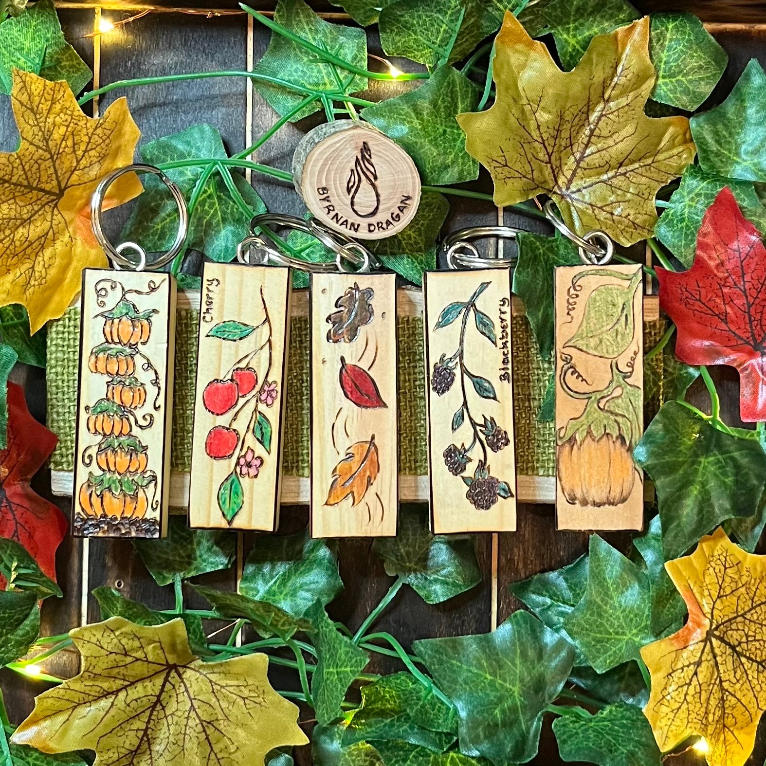 Chunky keyrings with an autumnal theme. Choose from pumpkins, blackberries, cherries or falling leaves.